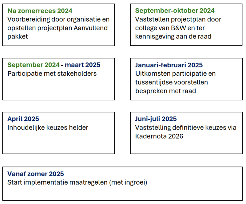 Wij hebben oog voor de ontwikkelingen in de samenleving en zijn ons er van bewust dat deze keuzes weliswaar noodzakelijk zijn, maar tegelijkertijd gevolgen hebben voor onze inwoners. Dit speelt met name met betrekking tot de maatregelen uit de scenario's die onderdeel zijn van het Aanvullend pakket. Met name die dienen als dekking voor de investeringen en beleidsimpulsen vanuit "Verantwoord groeien" en zijn nodig vanaf 2025. Fasering behoort hierbij nadrukkelijk tot de mogelijkheden. Dat geeft ons ook tijd om samen met u en onze inwoners in gesprek te gaan. Kort na het zomerreces leveren wij een projectplan op over hoe de scenario’s uit te werken. In dit projectplan zit nadrukkelijk ook het plan hoe raad, inwoners en maatschappelijke partners betrokken worden.Streven is dat de inhoudelijke keuzes in april 2025 helder zijn en definitief worden vastgesteld bij de Kadernota 2026. In het volgende stroomschema hebben wij de voorlopige stappen weergegeven. De definitieve uitwerking volgt in het projectplan.